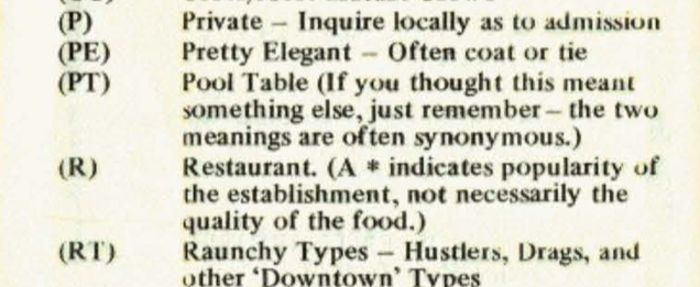 Figure 2. Explanation of Listings from 1977 Bob Damron Address Book, the first year PT is listed as an amenity feature.
