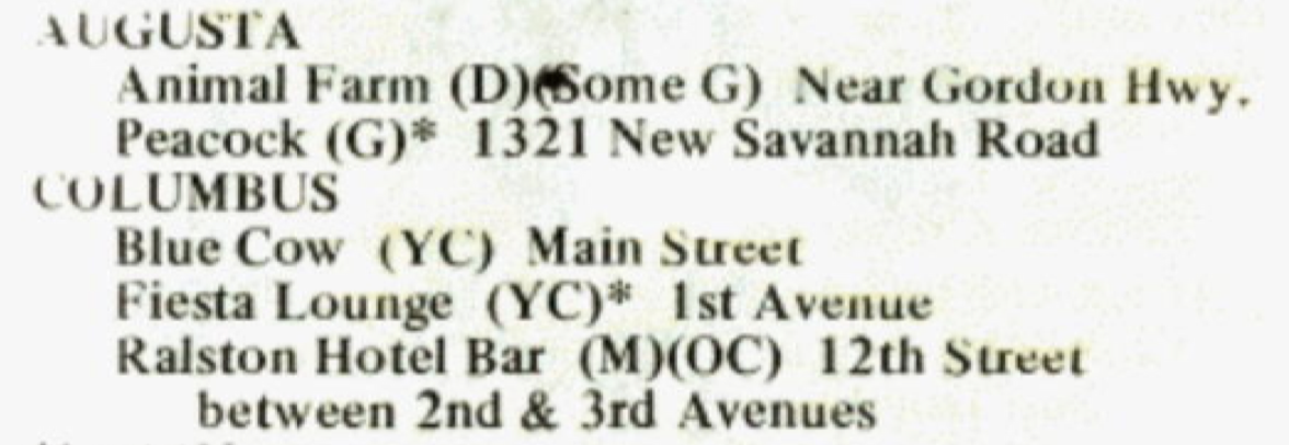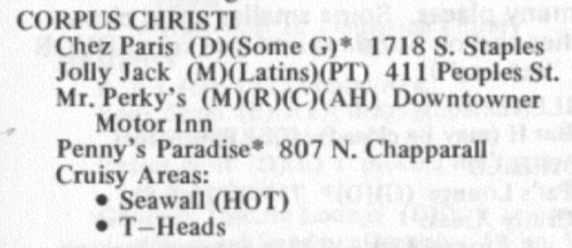 The amenities changed over time and Damron regularly added, removed, or changed the amenity for particular categories. One notable change is the amenity (G) for "Girls, but seldom exclusively" which appears in the 1960s guides but is later changed to (L) for "Ladies" and eventually (W) for "Women." This presents a unique challenge for displaying this data.